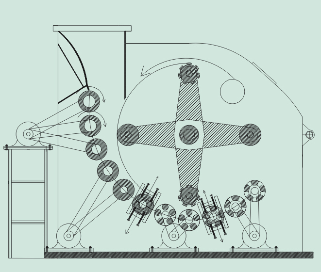 破碎物料進(jìn)入粗破的形式,由粗輥與反擊板相互刮削打擊運(yùn)動(dòng)使大塊物料破碎,然后進(jìn)入篩分系統(tǒng)達(dá)到粒度要求的直接送進(jìn)鍋爐,未過到要求粒度的再進(jìn)行到細(xì)破置進(jìn)行破碎,兩細(xì)破輥?zhàn)酉鄬?duì)差速運(yùn)轉(zhuǎn),具有相互刮削作用而強(qiáng)制排料,采用原料自由落差,全進(jìn)全出,對(duì)物料水分無任何要求。